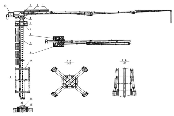 The installation of the concrete placing boom is divided into independent fixed and inner climbing, and the inner climbing is divided into floor climbing and elevator well climbing, which can meet the needs of different sites.